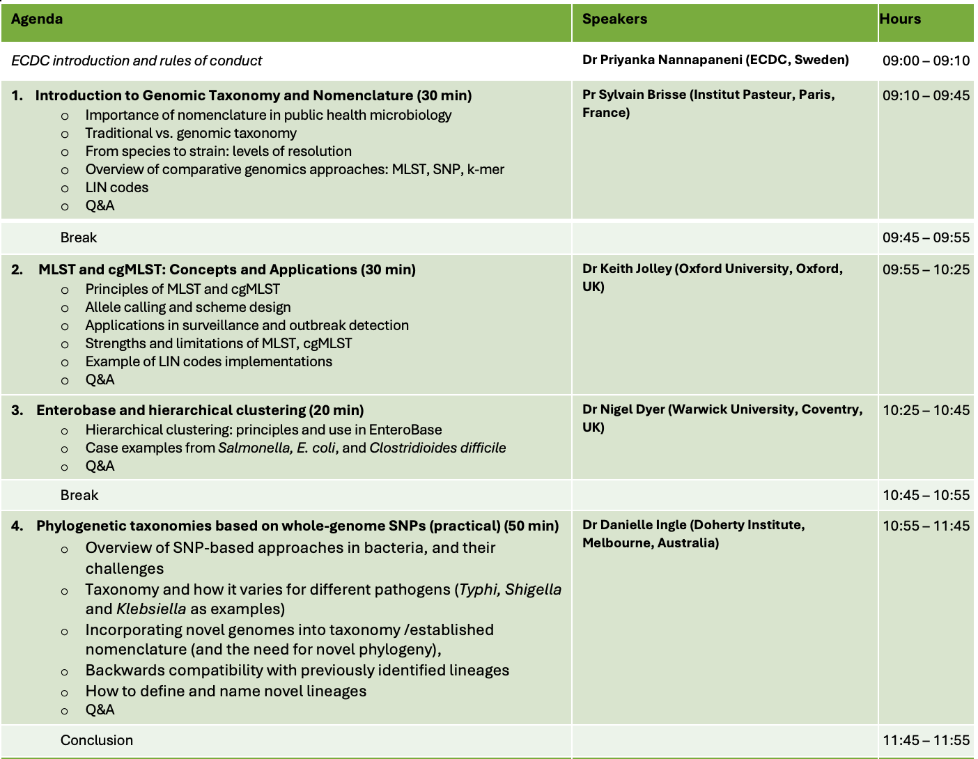 The aim of this virtual training workshop is to provide participants with a comprehensive understanding of bacterial classification and nomenclature approaches used in genomic surveillance. Participants will gain insight into MLST, cgMLST, SNP-based taxonomies, LIN codes, and k-mer-based clustering. The training will focus on how these systems are applied in public health microbiology to classify bacterial pathogens, track outbreaks, and support global surveillance efforts. Participants will also gain practical experience with tools such as BIGSdb, EnteroBase, MyKrobe, and PopPUNK, enabling them to apply bacterial taxonomy tools in genomic surveillance work..